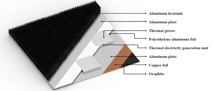 Image credit: [Jingming Li]Thermal electricity generation (TEG) is a potential method to utilize energy emitted from the built environment. This work presents a prototype of the low-cost full-day power generation solar building component, which can be integrated as the building fabric or as a part of the solar panels. The size of the prototype is 0.04 m2. The overall cost is less than 25 USD. The prototype is tested in various environments to validate its performance. The first experiment tests its performance under the radiation of a high-temperature source, the prototype can generate the highest voltage of 0.8 V. In onsite experiments, it can reach a maximum value of 10 mW/m2 under sunlight. It can also work at night depending on the thermal radiation of the environment. It can also be used in different weather; the performance is even better than the nighttime. The experiments indicate that radiation heat transfer has a stronger influence on energy conversion than the convective heat transfer. The relative humidity has a certain influence on its performance, but there is no obvious effect of radiation heat transfer. Although the prototype has great potential, there are still limitations, and this article also discusses the problems. Meanwhile, this article also points out possible directions for improving design in the future. The results in this article might be helpful for zero-energy buildings and low-carbon buildings.